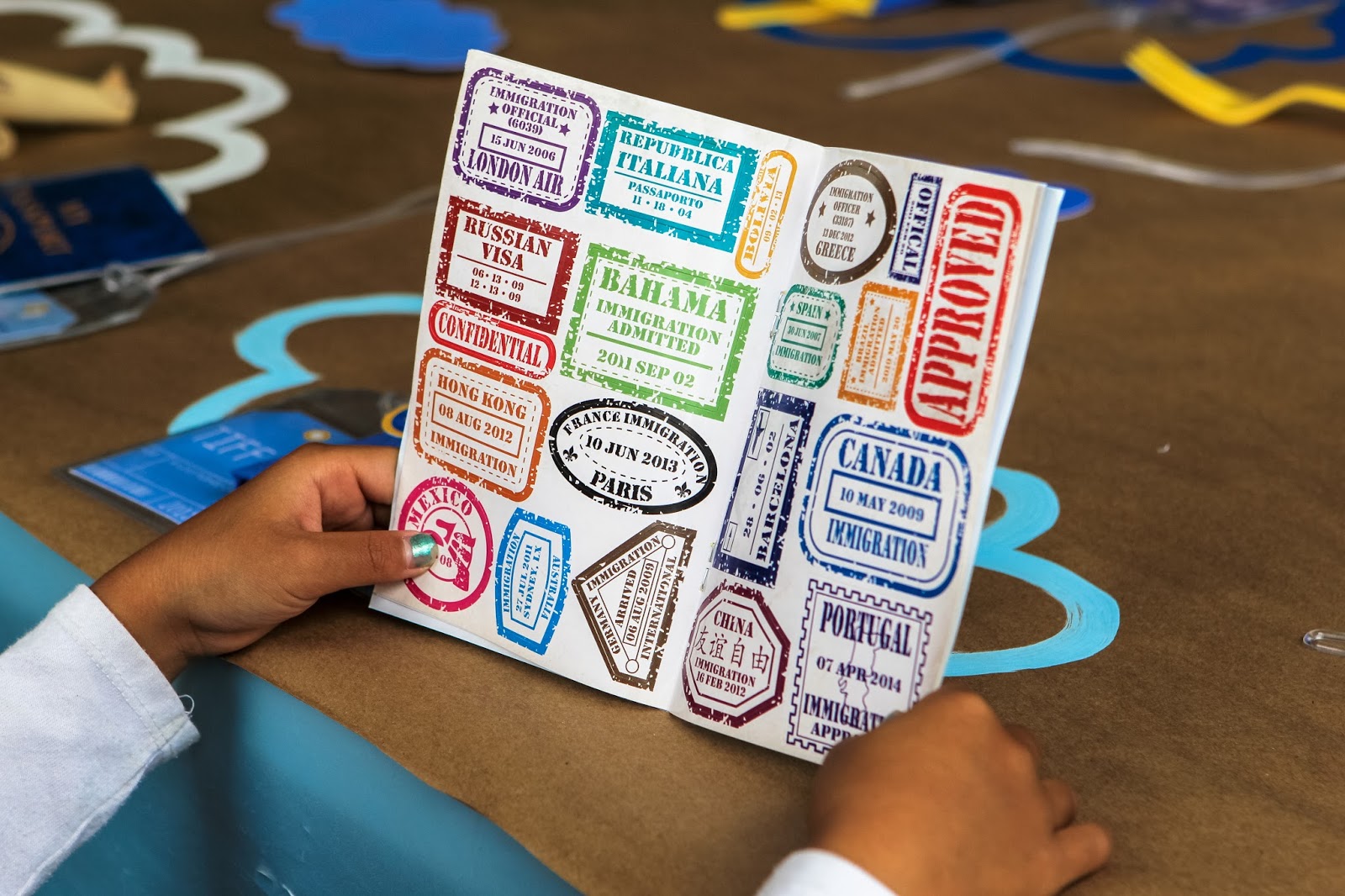 Passports were bought from Oriental Trading! Just didn't have the time to design/make those too haha--they were super fun--came with stickers!